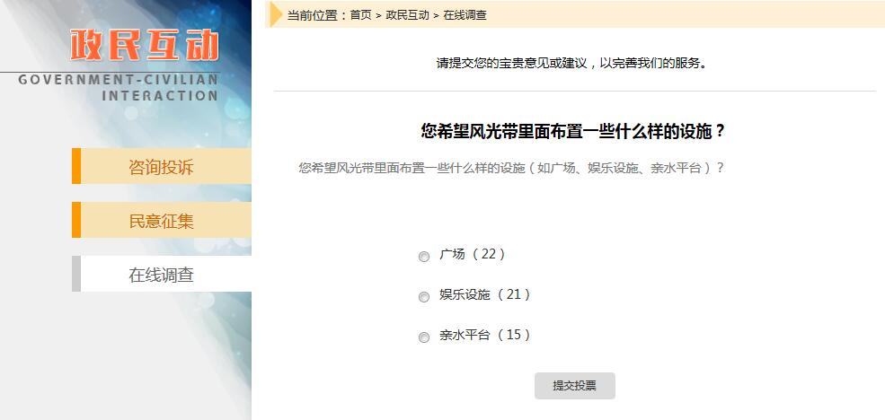 此功能政府類官方網(wǎng)站使用頻率效高,在提高政務(wù)親民度和群眾參與度上有很好的作用。一般用于在線調(diào)查、在線投票、民意征集等欄目。