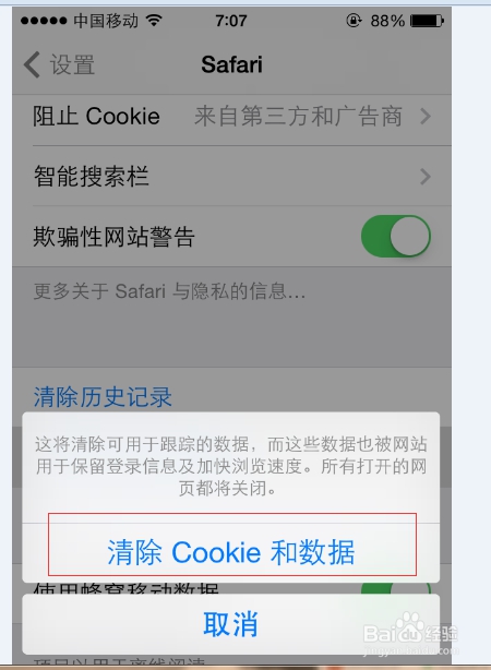 第三步進入“Safari”頁面后,我們下拉該頁面找到清除歷史記錄和清除Cookie和數(shù)據(jù)。