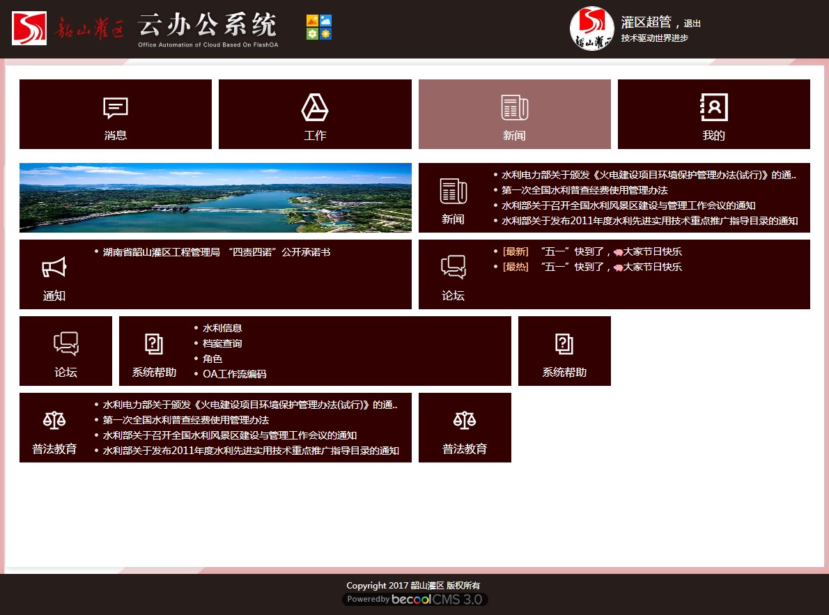 系統(tǒng)主要從單位門戶網(wǎng)站、云辦公系統(tǒng)、視頻會議、視頻監(jiān)控、智慧旅游、智能水利等版塊進(jìn)行系統(tǒng)建設(shè)和規(guī)劃,以更好地為山韶灌區(qū)服務(wù)和工作開展。