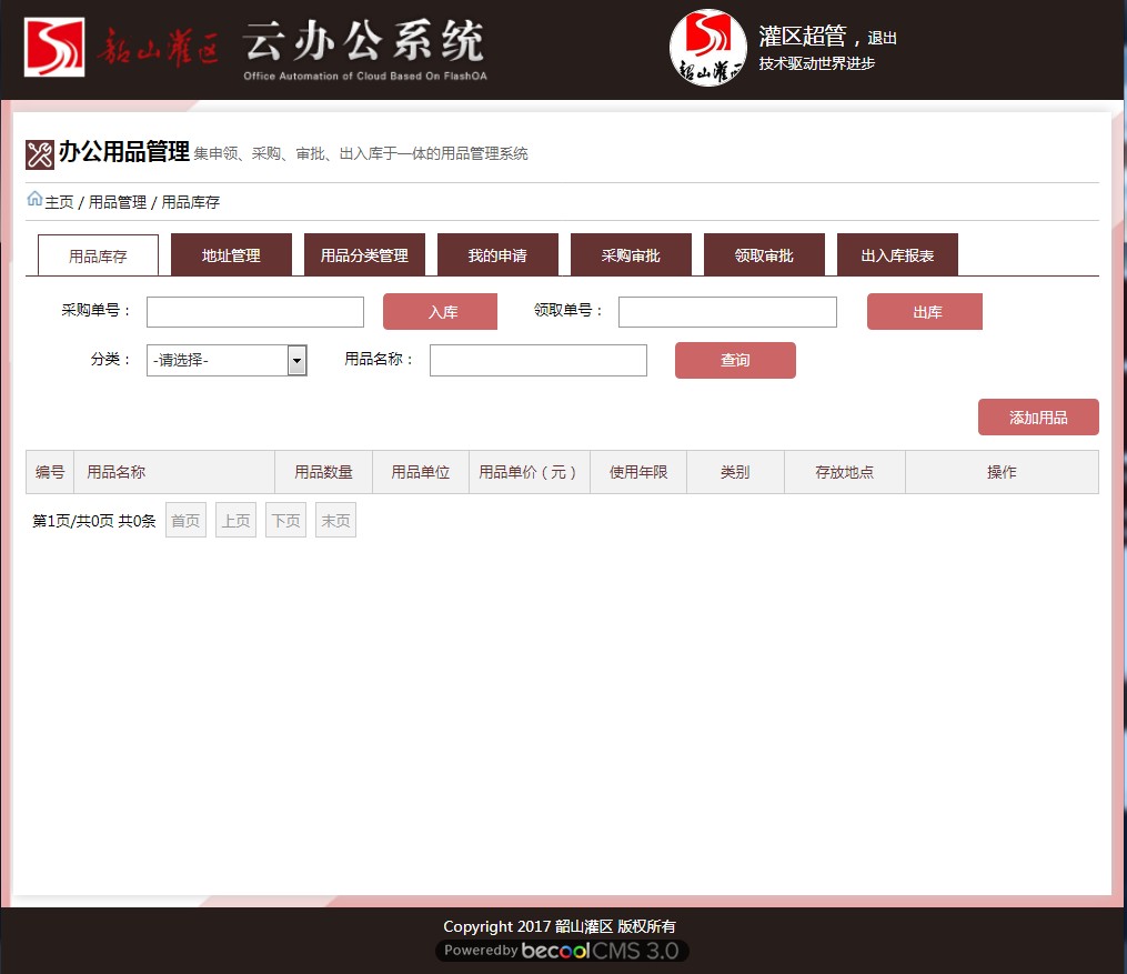 本模塊名為辦公用品管理,用于韶灌辦公區(qū)域的用品管理。特點(diǎn)是操作簡單方便,能滿足對用品的各種操作,這是集申領(lǐng)、采購、審批、出入庫于一體的用品管理系統(tǒng)。 |