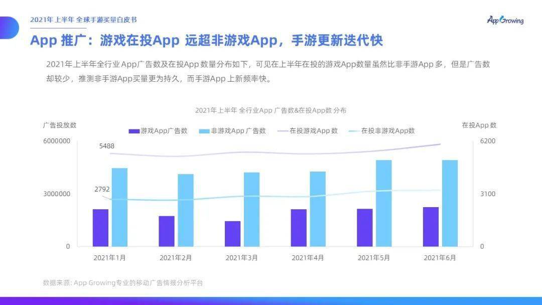 縱觀2021年上半年的手游買量市場,可見上半年廣告投放數(shù)呈現(xiàn)明顯的上升趨勢。手游App 上新快,投放力度強,買量依然是手游廣告主的重點獲客方式。