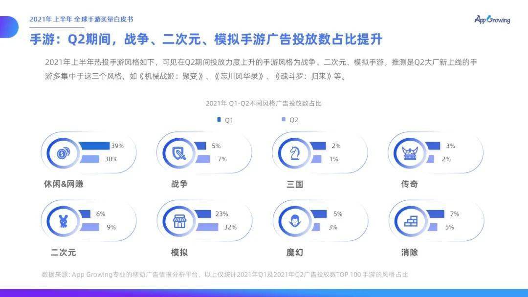統(tǒng)計2021年上半年的重點手游風(fēng)格,可以發(fā)現(xiàn)休閑&網(wǎng)賺、戰(zhàn)爭、三國是今年上半年投放力度最強的三大重點手游風(fēng)格,而同比Q1時,戰(zhàn)爭、二次元、模擬在Q2投放力度提升。